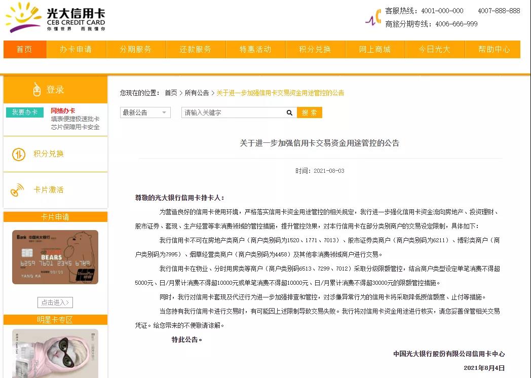 8月4日,光大银行发布《关于进一步加强信用卡交易资金用途管控的公告》。