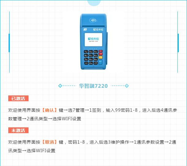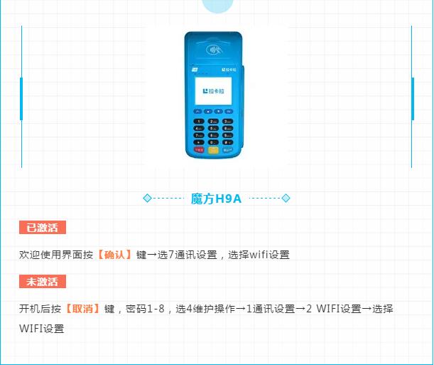 以上便是为大家整理的关于拉卡拉旗下华智融7220、魔方H9A以及联迪E350三款传统POS机的连接WIFI操作流程,希望对各位用户有所帮助,同时友情提示大家,在连接操作之前应先核查当前使用的机器是否支持WIFI功能哦,如果不支持的话,可以拨打站内联系方式或提交表单信息进行申请最新款机器。