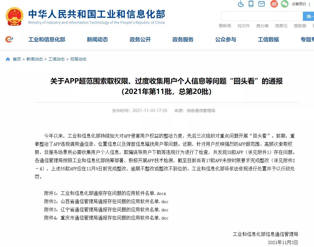 11月3日,工信部通报第三次“回头看”检查结果,通报显示今年以来,工业和信息化部持续加大对APP侵害用户权益的整治力度,先后三次组织对重点问题开展“回头看”。前期,重拳整治了APP违规调用通信录、位置信息以及弹窗信息骚扰用户等问题。