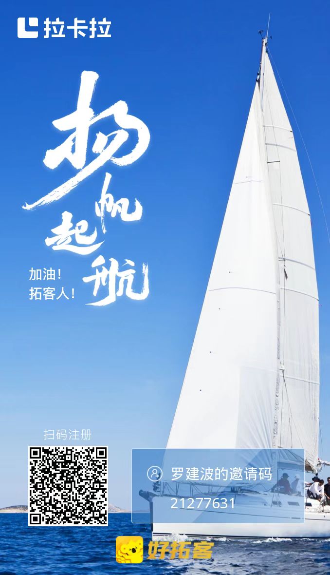 好拓客是拉卡拉基于支付从业人员需要稳定和发展的诉求于2021.4.1号全新启动的2.0平台模式,政策公开透明,分润总部秒发,采用裂变和倍增的分享机制,不涨价不跳码永久分润,是行业最稳定和健康的全新创业平台