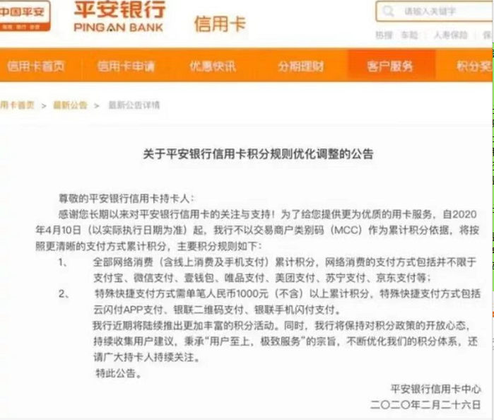 自2020年4月10日开始平安银行信用卡积分不在以pos机交易商户编码(MCC)作为积分奖励依据,就是说无论你在什么pos机上交易都是没有积分的,那平安平安银行信用卡是不是就没有积分了?答案是网络消费还是可以累积积分的,什么是网络消费,就是用微信、支付宝、京东支付、银联云闪付、银联手机闪付等网络支付还是可以累积积分的。