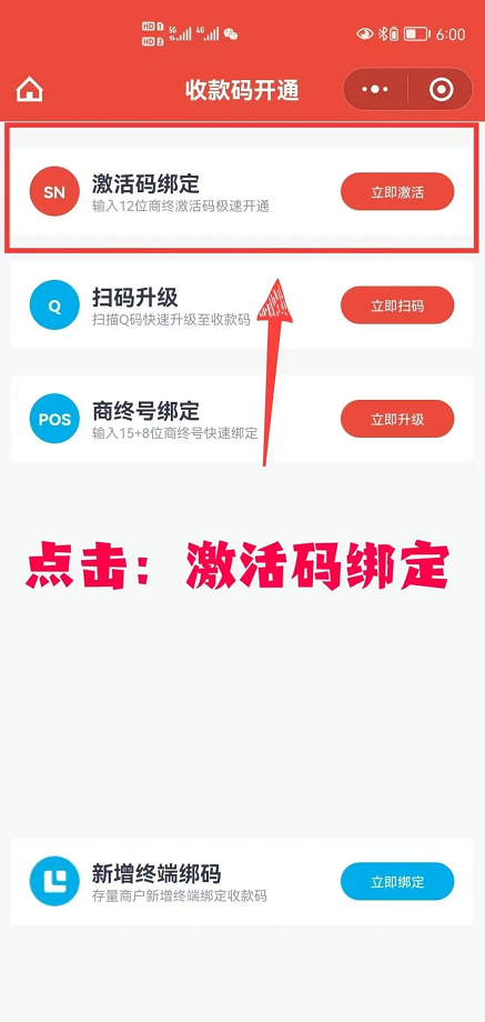 拉卡拉码牌:用微信扫码牌,打开【立即开店】-选择【激活码绑定】-输入【激活码】+【法人身份证号】绑定